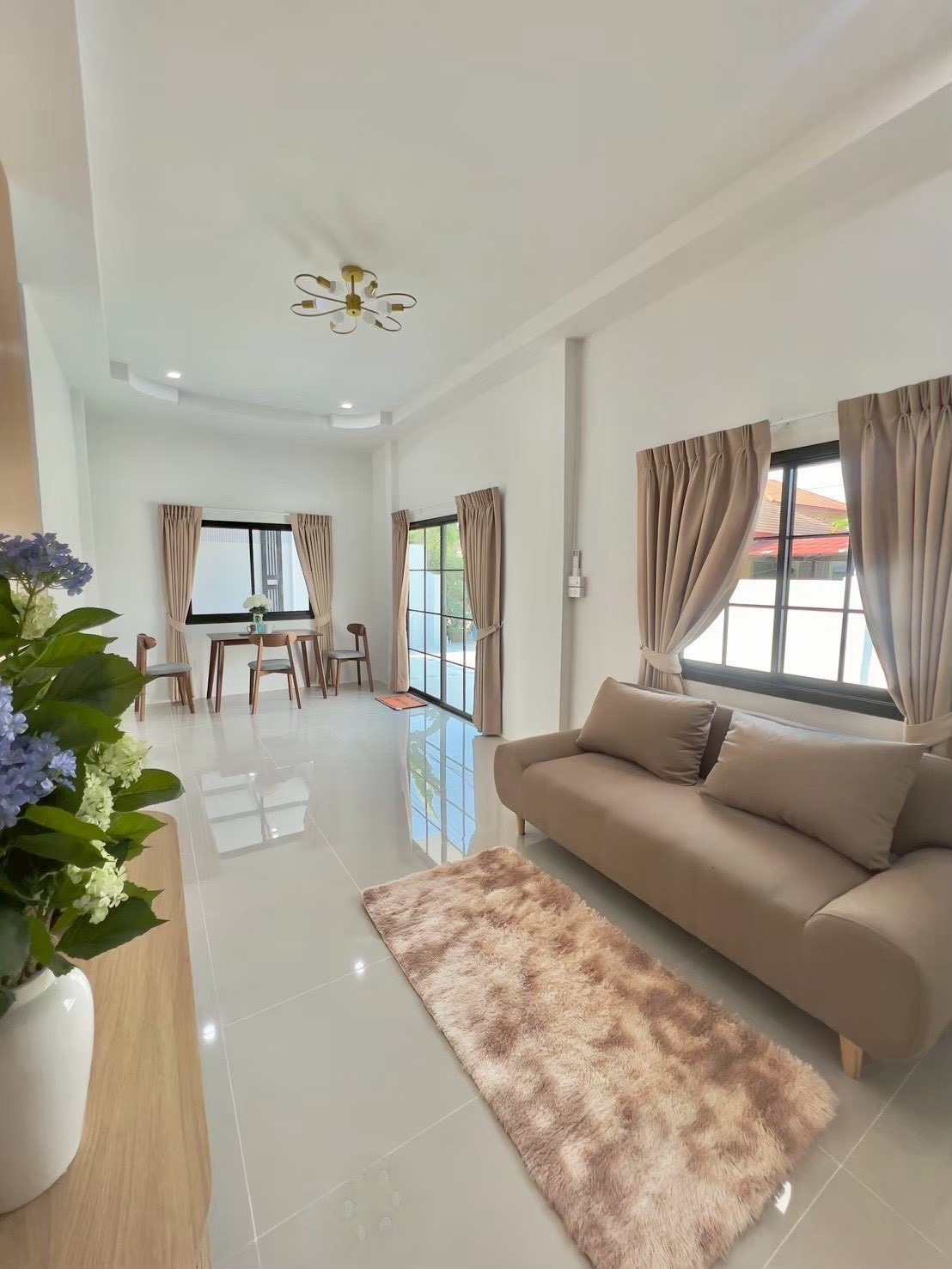 เฟอร์นิเจอร์ : โซฟา สตูทีวี โต๊ะกินข้าว แอร์ 18,000 btu 1 เครื่อง ปั้มน้ำ ถังเก็บน้ำ ฮู้ด ผ้าม่านทั้งหลัง